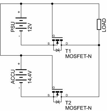Podstawowa przyczyna to brak sterowania tranzystorami. Zasilacz polaryzuje „swój” T1 napięciem 12 V, przez co jego kanał przewodzi. Ale akumulator również nie próżnuje i aplikuje „swojemu” T2 napięcie rzędu 14,4 V między bramkę, przez co on również przewodzi. Z lekcji podstaw elementów półprzewodnikowych wiemy z kolei, że nośniki w raz utworzonym kanale mogą płynąć w obie strony, ponieważ wszystkie trzy obszary (drenu, źródła i kanał między nimi) mają ten sam typ przewodnictwa, więc na żadnej z dwóch granic (źródło-kanał lub dren-źródło) nie tworzy się złącze. Mamy zatem zasilacz zwarty z akumulatorem przy użyciu dwóch elementów półprzewodnikowych, które nic sobie nie robią z faktu, że mają być tutaj jakimiś diodami. Dlatego też akumulator „pcha” prąd w zasilacz (co może go uszkodzić), jak również zasilacz doładowuje akumulator (co niepotrzebne zużywa energię z sieci oraz w sposób niekontrolowany ładuje akumulator).