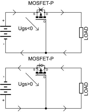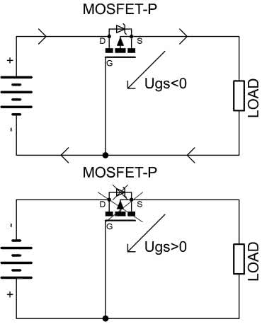 Tutaj nie da się zaradzić nic mądrego, bo ten układ jest po prostu do kitu. Do mądrzejszego sterowania tymi tranzystorami trzeba zastosować bardziej rozbudowany układ, jak chociażby AVT5658. Warto jednak zwrócić uwagę na jeszcze jedną niedoskonałość układu znanego jako dioda idealna. Przeanalizujmy jeszcze raz układ z rysunku 2, dla uproszczenia tylko z tranzystorem MOSFET-P, w dwóch sytuacjach: ze źródłem zasilania wpiętym prawidłowo oraz odwróconym – rysunek 4. W sytuacji „prawidłowej” przewodzi tranzystor, bo jego napięcie bramka-źródło jest ujemne. Z kolei w sytuacji „nieprawidłowej”, prąd płynie przez diodę tworzącą się w strukturze tranzystora i głęboko w nosie ma jakiś zatkany tranzystor – ten układ po prostu nie działa, ponieważ ktoś radośnie zlekceważył diodę między drenem a źródłem (dokładniej: między drenem a podłożem zwartym ze źródłem) w tranzystorze MOSFET.