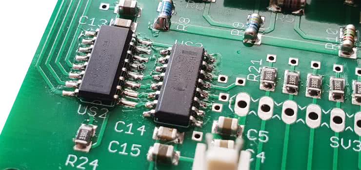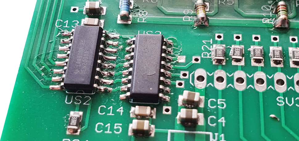 Prezentowane układy powinny być zasilane napięciem nie wyższym niż 5,5 V i takie właśnie napięcie powinno być doprowadzone do całej płytki. Kostki sterowały driverami ULN2003, które w momencie „badania” urządzenia okazały się w pełni sprawne. Po pokazaniu klientowi zdjęć ten przyznał się, że podłączył zasilanie 12 V zamiast ustalonego napięcia 5 V i stąd te uszkodzenia. Same układy oczywiście nie działały, ale nie pobierały żadnego prądu, zaś na ich obudowach znalazły się jedynie ledwie widoczne pęknięcia.