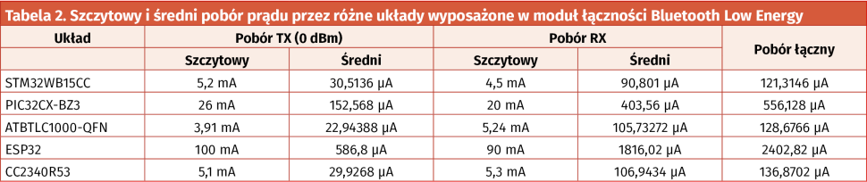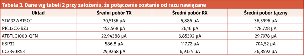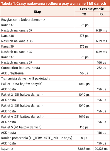 Po zakończeniu sesji moduł łączności można wyłączyć. Warto zauważyć, że czas powtarzania „reklam” został podzielony na trzy mniejsze interwały, by każdy kanał miał czas na odebranie odpowiedzi z hosta. Przyjęto też założenie, że host nie musi zareagować od razu, stąd trzy nieudane próby. Przeliczmy to zatem na średni pobór prądu wybranych układów, nie uwzględniając niczego prócz zapotrzebowania samego modułu łączności Bluetooth. Wyniki zebrano w tabeli 2.