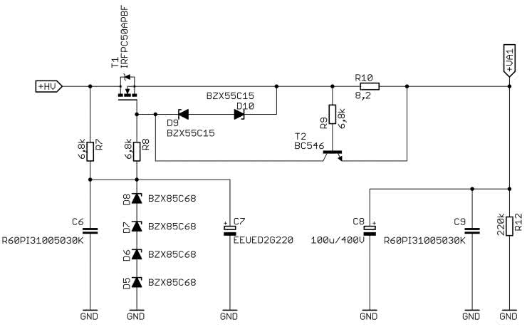 To napięcie jest „powtarzane” przez tranzystor MOSFET, przez co owe diody nie są w ogóle obciążane prądem jego bramki, zaś potencjał jego źródła jest o około 8…10 V niższy od tego, który ustaliły diody. Układom lampowym jest wszystko jedno, czy będą zasilane napięciem 274 V, czy 272 V, stabilizację stosuję głównie w celu poprawy filtracji tętnień napięcia anodowego. Diody Zenera D9 i D10 chronią tranzystor przez przebiciem jego dielektryka podbramkowego. Temu samemu służy też poniekąd układ ograniczający natężenie prądu wyjściowego, zawierający tranzystor T2, bowiem zmniejsza on napięcie bramka-źródło tranzystora T1 tak, aby na rezystorze R10 odkładało się napięcie nie większe niż około 0,6…0,7 V. Takie sytuacje zdarzają się przede wszystkim podczas ładowania kondensatorów w układzie, tuż po załączeniu zasilania.