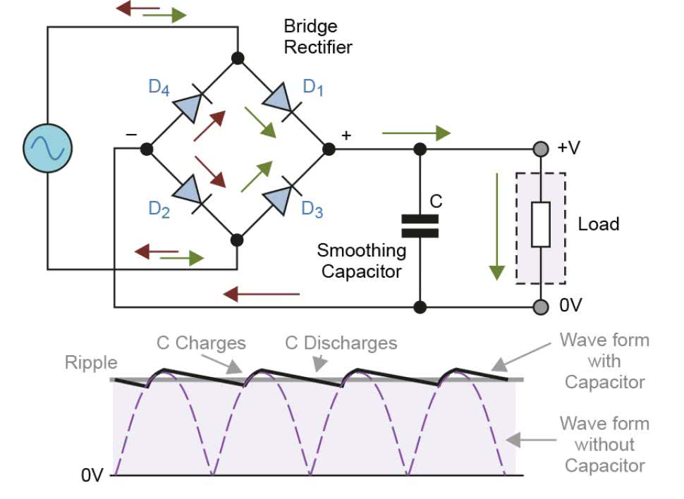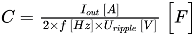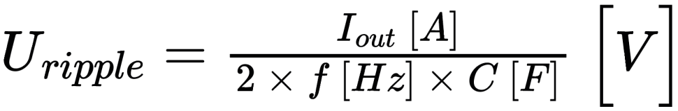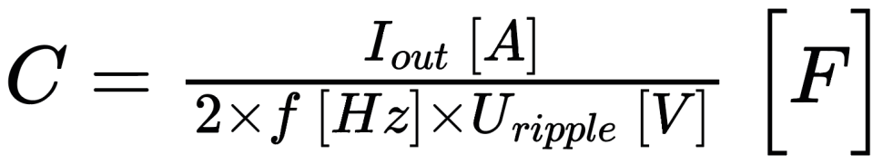 gdzie: Iout to prąd pobierany z kondensatora filtrującego, f to częstotliwość napięcia przemiennego wchodzącego na prostownik, zaś C to oczywiście pojemność kondensatora filtru.