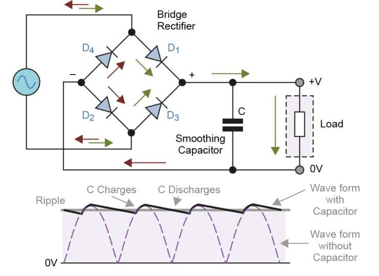 Całkowicie typowa sytuacja: prostownik dwupołówkowy prostuje napięcie przemienne z transformatora, za prostownikiem znajduje się kondensator obciążony rezystancją imitującą zasilany układ. Schemat takiego tworu oraz przybliżony przebieg napięcia na zaciskach tegoż kondensatora pokazano na rysunku 1. Najczęściej ten przykład przytacza się w nawiązaniu do prostowania napięcia sieciowego o częstotliwości 50 Hz (tudzież 60 Hz), lecz w przypadku przetwornic impulsowych te przebiegi również są podobne. Nie jest zagadką także działanie takiego filtra: kondensator zostaje doładowany impulsem prądu dostarczanym przez diody w trakcie dochodzenia napięcia do wartości maksymalnej, po czym się rozładowuje przez pozostałą część (czyli więcej niż połowę, bo napięcie na kondensatorze nie spada do zera) okresu napięcia wejściowego. Im większy jest prąd pobierany z kondensatora filtrującego, tym silniej ulegnie on rozładowaniu przed następnym ładowaniem. Warto również zauważyć, że krzywa narastania napięcia na kondensatorze w trakcie jego ładowania odtwarza dokładnie taki sam kształt, jak przebieg napięcia podanego na prostownik, z różnicą w postaci spadku napięcia na diodach prostowniczych.