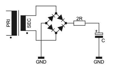 Oczywiście z punktu widzenia teorii obwodów da to taki sam efekt, jak wstawienie jednego rezystora, o wartości równej sumie dwóch poprzednich, zaraz za mostkiem – rysunek 4. Jaki ma to wpływ na układ? Jeżeli chodzi o fazę rozładowywania kondensatora, tutaj nie zmienia się nic – prąd jest pobierany z jego okładek, diody prostownika pozostają w tym czasie zatkane, napięcie na kondensatorze spada. Natomiast dzieje się coś innego, bowiem... wydłuża się faza ładowania kondensatora. Jest tak, ponieważ rośnie rezystancja wewnętrzna źródła ładującego kondensator, więc dostarczenie do niego tej samej porcji ładunku (doładowanie go) zajmie więcej czasu. Jednak w rzeczywistym układzie nie ma więcej czasu, ponieważ okres napięcia wejściowego jest nadal taki sam. Czyli, tak naprawdę, kondensator ten nie doładowuje się do maksymalnej wartości, czyli wartości szczytowej napięcia za prostownikiem. Oznacza to, że wartość średnia takiego napięcia zmniejsza się, czyli... maleje składowa stała, na której utrzymaniu (na właściwym poziomie) tak naprawdę nam zależy.