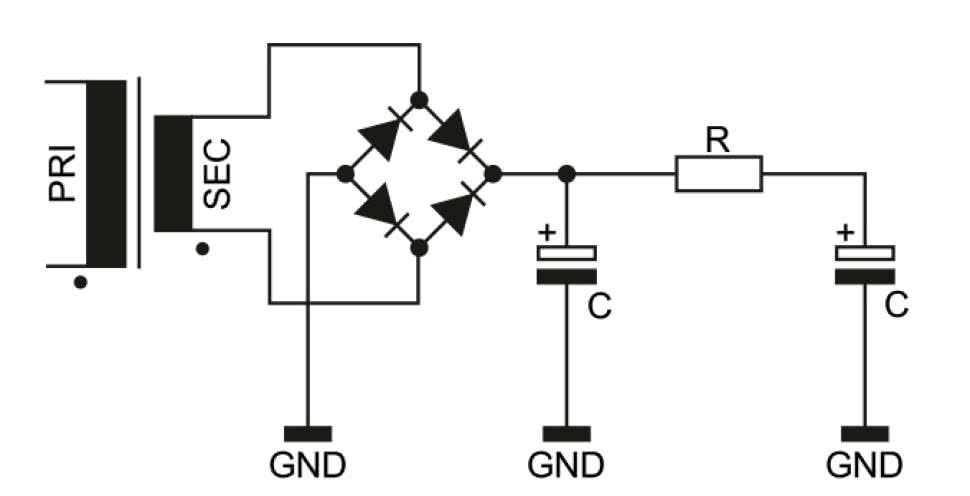 Potrzebujemy zatem filtru dolnoprzepustowego o możliwie niskiej częstotliwości odcięcia, bowiem interesująca jest dla nas jedynie składowa stała. Można więc zastosować filtr RC, znany pod nazwą CRC, po uwzględnieniu pierwszego kondensatora wygładzającego, który w tej roli sprawdzi się lepiej niż pojedynczy kondensator – patrz rysunek 2. Utrudnieniem jest fakt, że wypadkowa rezystancja takiego filtru wpływa na spadek napięcia, wobec czego napięcie wyjściowe może się okazać nieakceptowalnie niskie. Z tego powodu takie układy filtrujące, w tym wieloczłonowe, najczęściej spotyka się w urządzeniach lampowych, gdzie strata kilkunastu czy nawet kilkudziesięciu woltów nie jest bolesna dla konstruktora, a niekiedy wręcz pożądana z punktu widzenia dopasowania zasilacza do konkretnego układu. Jednak również w zasilaczach cyfrowych urządzeń półprzewodnikowych, zwłaszcza przetwarzających sygnały (przy wysokich wymaganiach co do ich jakości) również się je spotyka.