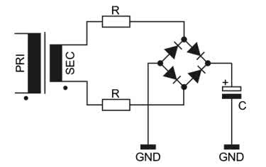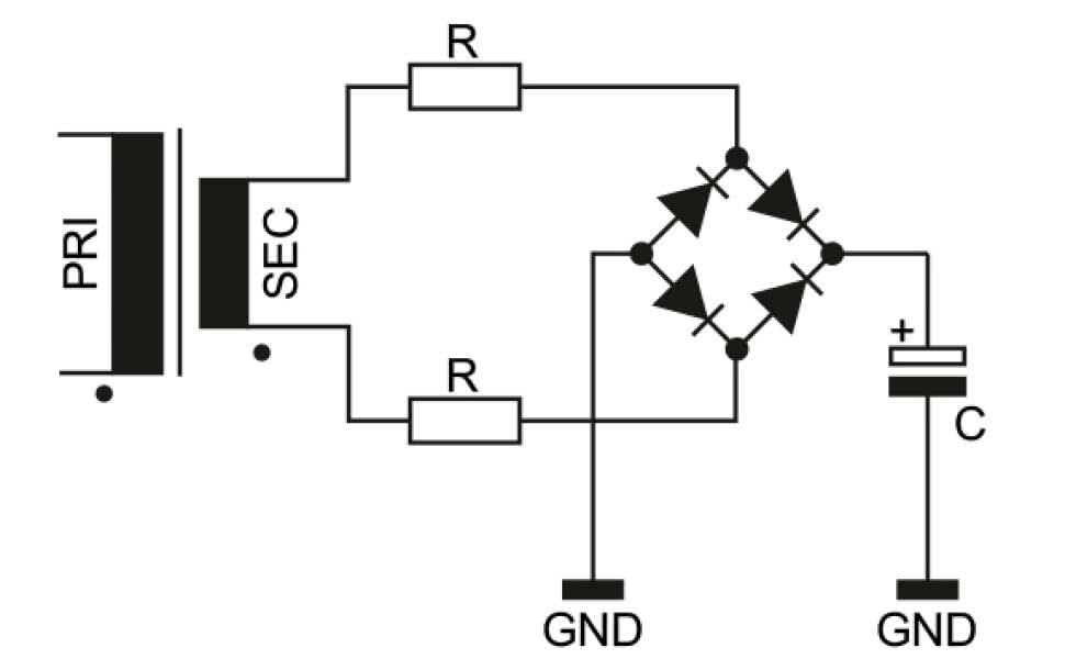Zauważyłem już w kilku miejscach praktykę polegającą na wstawianiu rezystorów przed prostownik, jak na rysunku 3.