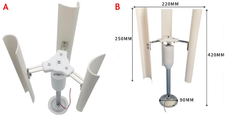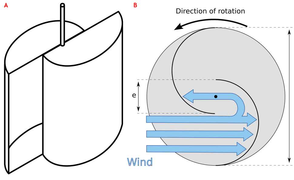 Turbiny VAWT dzielą się na dwa podstawowe typy: turbiny Savoniusa i Darrieusa. Turbina Savoniusa ma niższą sprawność i prędkość obrotową, ale pracuje przy niższych prędkościach wiatru i startuje samodzielnie. Rysunek 4 pokazuje poglądowy schemat budowy turbiny tego typu i jej zasadę działania. Moc maksymalna takiej turbiny jest wprost proporcjonalna do iloczynu wysokości rotora, jego średnicy oraz trzeciej potęgi prędkości wiatru. Konstrukcja jest na tyle prosta, że małe modele, o mocach liczonych w pojedynczych watach, można bezproblemowo wykonać metodą druku 3D.
