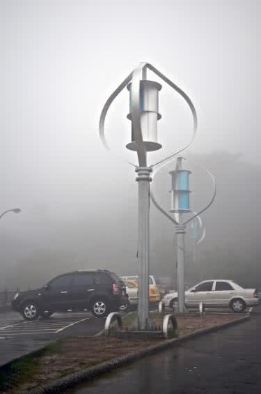 Drugim popularnym źródłem energii odnawialnej są turbiny wiatrowe. Na rynku dostępne są rozwiązania o mocach od kilkuset watów do dziesiątek megawatów. Turbiny wiatrowe dzielą się na dwa podstawowe rodzaje: HAWT (ang. Horizontal Axis Wind Turbine) – turbiny o poziomej osi obrotu, oraz VAWT (ang. Vertical Axis Wind Turbine) – turbiny o pionowej osi obrotu. Turbiny HAWT to bardziej tradycyjne rozwiązania, o sporej wydajności, których moc jest proporcjonalna do pola powierzchni śmigła i kwadratu prędkości wiatru. Startują same i same ustawiają się prostopadle do wiatru dzięki aerodynamicznemu kształtowi obudowy, która zachowuje się jak statecznik pionowy samolotu. Duże, komercyjne turbiny wiatrowe mają wbudowany mechanizm hamujący i zmieniający kąt natarcia łopat śmigła, gdyż przy zbyt dużej prędkości wiatru turbina mogłaby zostać rozerwana przez naprężenia wywołane siłą odśrodkową. Turbina tego typu ma też inny problem: turbulencje na końcach śmigła ograniczające wydajność i wytwarzające nieprzyjemny dźwięk. Duże turbiny wiatrowe osiągają typowy poziom głośności u podstawy około 60 dB. 500 metrów od turbiny wartość ta spada do około 38 dB i często znika pośród innych dźwięków otoczenia.