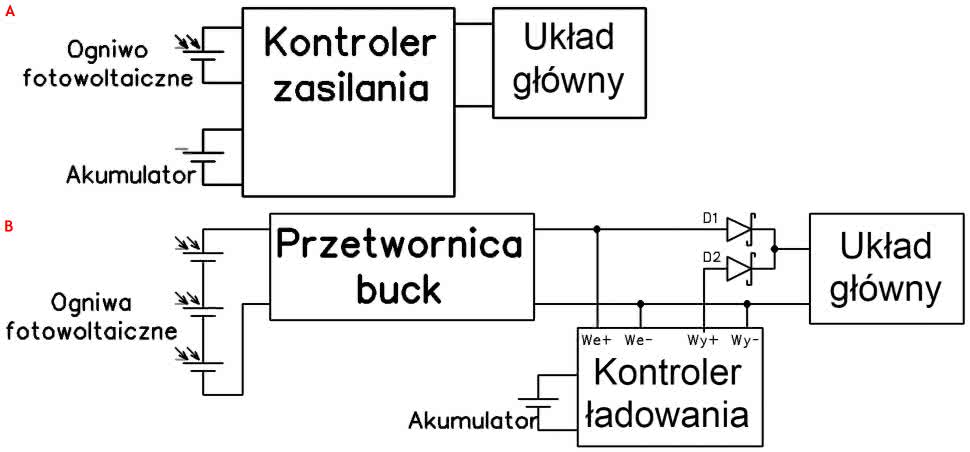 Przetwornice MPPT są szczególnie istotne tam, gdzie zachodzi potrzeba maksymalizacji sprawności instalacji, co ma znaczenie w produkcji energii na dużą skalę. W przypadku małych, energooszczędnych urządzeń takie rozwiązanie może jednak niepotrzebnie zwiększać koszty. Zamiast niego można podłączyć ogniwa bezpośrednio do układu, jak robi się to w przypadku niewielkich urządzeń wspomnianych na początku artykułu, albo pośrednio – przez kontroler zasilania – by móc przełączać się między trybem fotowoltaicznym lub bateryjnym. Do układów wykorzystujących akumulator zamiast baterii istnieją dwa inne rozwiązania stosowane powszechnie i pokazane na rysunku 3.