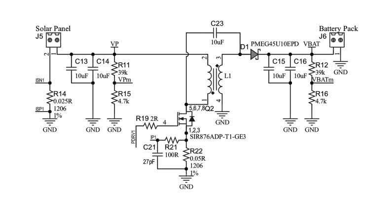 Rysunek 1 pokazuje charakterystyki I(U) oraz P(U) ogniwa fotowoltaicznego. Na charakterystyce P(U) zaznaczono punkty maksimum mocy dostarczanej przez ogniwo. W celu maksymalizacji sprawności stosuje się technikę o nazwie MPPT (ang. Maximum Power Point Tracking), czyli śledzenie punktu mocy maksymalnej. Technika ta bazuje na przetwornicy impulsowej, ale poza stabilizacją napięcia wyjściowego jej kontroler mierzy też napięcie i prąd wejściowy – i tak reguluje pracę przetwornicy, by iloczyn zmierzonych parametrów osiągał maksymalną możliwą wartość. Uproszczony schemat głównego toru zasilania takiej przetwornicy widać na rysunku 2. R14 to bocznik do pomiaru prądu ogniwa, zaś dzielnik napięcia na rezystorach R11 i R15 kontroluje napięcie panelu. Dzielnik R12-R16 pozwala na pomiar napięcia wyjściowego przetwornicy, czyli napięcia podanego na pakiet akumulatorów (wyposażony we własny kontroler ładowania). Sama przetwornica w topologii flyback składa się z dławika sprzężonego L1, tranzystora kluczującego dużej mocy Q2 oraz diody D1. R22 i elementy współtowarzyszące pozwalają mierzyć prąd płynący przez dławik, co pośrednio chroni przetwornicę w razie zwarcia na wyjściu. Kontroler na bieżąco reguluje wypełnienie sygnału sterującego tranzystorem Q2 tak, by stabilizować napięcie wyjściowe, jednocześnie maksymalizując moc pobieraną z ogniw fotowoltaicznych. Pomiar prądu płynącego przez Q2 i dławik chroni też układ przed przeciążeniem. Warto pamiętać, że nie jest konieczne stosowanie przetwornicy typu flyback – w tej aplikacji sprawdzi się dowolna inna topologia, od przetwornicy typu buck, po przetwornicę pełnomostkową, zależnie od potrzebnej mocy.
