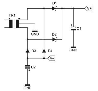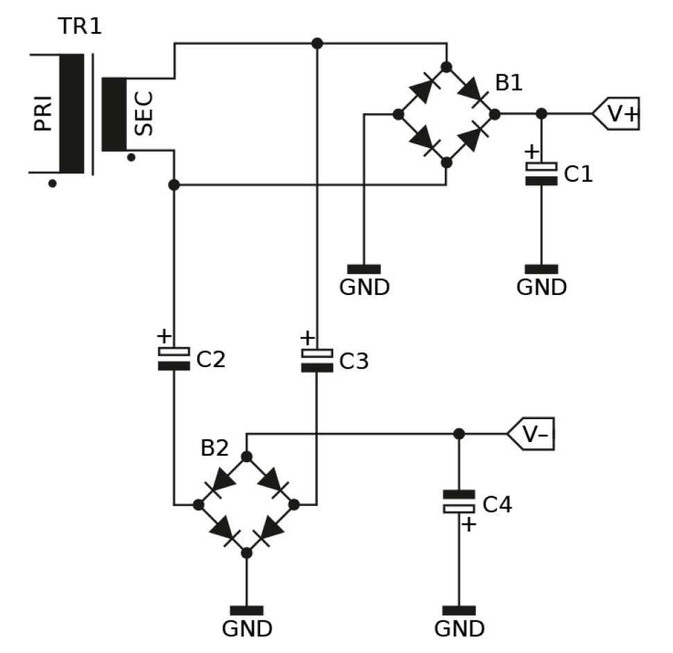 Jednak nie zawsze mamy do dyspozycji transformator z dzielonym uzwojeniem wtórnym. Prawdę mówiąc, w nowoczesnych układach to dosyć rzadko spotykane rozwiązanie. Częściej mamy do czynienia z sytuacją, w której pojedyncze uzwojenie wtórne jest podłączone do wejścia prostownika w układzie Graetza. Czymś w pełni prawidłowym byłoby użycie drugiego uzwojenia, do zasilenia drugiego prostownika - jednak nie zawsze jest to możliwe i/lub opłacalne. Użycie układu jak z rysunku 1 lub rysunku 2 nie jest możliwe, cóż więc czynić? Można „dobudować” prosty obwód składający się z dwóch kondensatorów elektrolitycznych, które zapewnią polaryzację diod w drugim mostku Graetza (rysunku 3). W praktycznych zastosowaniach kondensatory C2 i C3 mają pojemność rzędu 1000 μF lub więcej, co pozwala na pobranie z „ujemnego” wyjścia tak powstałego zasilacza prądu o natężeniu kilkudziesięciu miliamperów. Jedyną przeszkodą jest tutaj reaktancja kondensatorów. Trzeba również mieć na uwadze spadek napięcia na tychże kondensatorach, wywołany ową reaktancją.