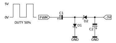 No dobrze, a jeżeli w ogóle nie mamy do dyspozycji napięcia przemiennego, to co wtedy? Mamy układ zasilany, dajmy na to, z akumulatora bądź zespolonej przetwornicy impulsowej. Układy typu ICL7660, dedykowane do wytwarzania napięcia ujemnego, są dosyć drogie i mają mocno ograniczone parametry. Wtedy pomocny może okazać się dobrze znany obwód z rysunku 4. Na jego wejście podaje się przebieg prostokątny o wypełnieniu 50% i częstotliwości rzędu kilkuset herców do kilku kiloherców. Im wyższa będzie jego amplituda, tym wyższe (co do wartości bezwzględnej) napięcie ujemne otrzymamy na wyjściu - w praktycznych realizacjach, przy użyciu diod Schottky’ego, trzeba liczyć się ze stratą napięcia wynoszącą około 2 V. Polecam przy tym stosować kondensatory elektrolityczne lub tantalowe o pojemności 100 μF lub zbliżonej, choć ten układ jest w stanie wiele wybaczyć.