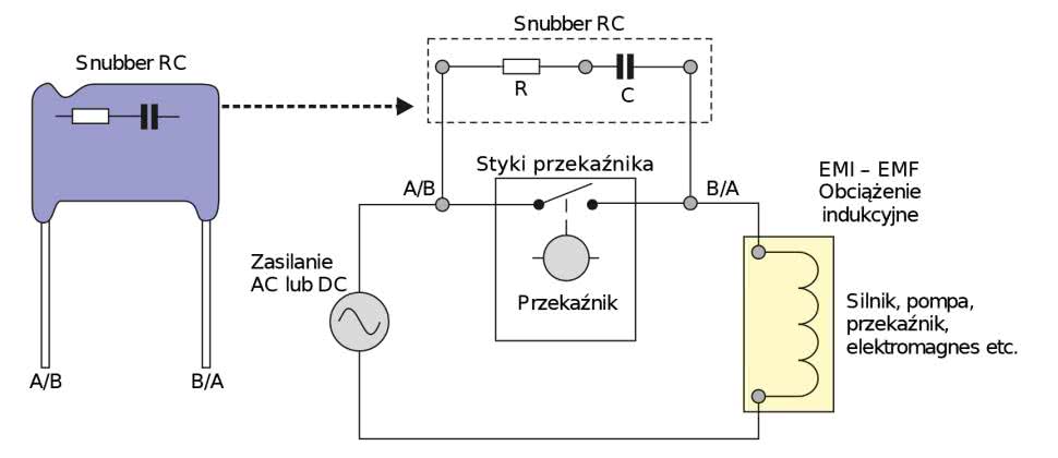 To powoduje, że prąd w owej indukcyjności nie zanika zbyt szybko (dzięki zmniejszeniu dI/dt), co z kolei redukuje amplitudę napięcia impulsu samoindukcji (dV/dt). W ten sposób można skutecznie ograniczyć zjawisko iskrzenia styków i ryzyko powodowane przez impulsy wysokiego napięcia na elementach półprzewodnikowych. Snubbery często można znaleźć przy triakach, właśnie w celu ograniczenia szybkości narastania prądu, który mógłby spowodować ich samoczynne wyzwolenie [2].