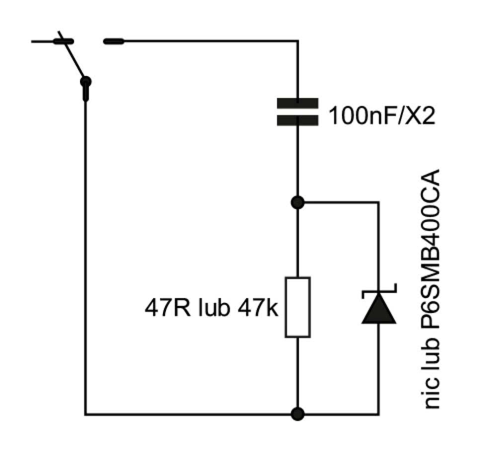 Jeżeli chodzi o kondensator, to tutaj przyznaję, że bardzo często wystarcza klasyczne 100 nF. Taka pojemność wystarcza, aby podtrzymać przepływ prądu w ewentualnej indukcyjności obciążenia, aż do płynnego zaniku energii w niej zgromadzonej. Jednak nie może to być byle jaki kondensator, głównie z powodu wytrzymałości dielektryka. Do zastosowań przeciwzakłóceniowych przeznaczone są polipropylenowe kondensatory o oznaczeniu X2.
