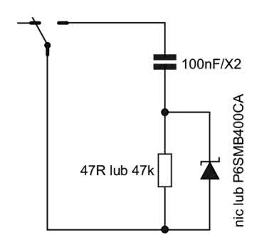Topologie obwodów gaszących są rozmaite, mniej lub bardziej złożone, lecz jako punkt startowy do dalszych rozważań chcę przyjąć układ najprostszy, czyli RC – jak na rysunku 1. Rezystor i kondensator połączone są szeregowo, zaś taki układ jest włączony równolegle do elementu przełączającego zasilanie dla jakiegoś obciążenia o bliżej nieznanych parametrach.