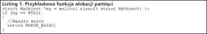 W języku C nie istnieje żaden specjalizowany mechanizm obsługi sytuacji wyjątkowych, a do ich obsługi najczęściej wykorzystywana jest wartość zwracana przez funkcję, która jest porównywana z pewnymi wartościami specjalnymi, reprezentującymi błąd. Typowym przykładem jest tutaj alokacja pamięci, która w programie napisanym w C wygląda, jak na listingu 1.