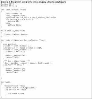 W najlepszym wypadku brak sprawdzenia rezultatu alokacji pamięci w systemach operacyjnych z ochroną pamięci doprowadzi do błędu Segmentation Fault. Spójrzmy na typowy, przykładowy fragment programu inicjalizujący układy peryferyjne, gdy jeden zasób jest potrzebny do działania drugiego. Zamieszczono go na listingu 2.
