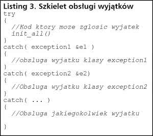 Mechanizm ich działania polega na tym, że kod w przypadku wystąpienia błędu zamiast zwracać rezultat funkcji informujący o błędzie rzuca wyjątek za pomocą wywołania throw exception(), gdzie exception() jest to klasa wyjątku, który będzie rzucony (najwygodniej jest w tym miejscu używać obiektów tymczasowych). Natomiast w innej części programu fragment, który może potencjalnie rzucić wyjątek zostaje umieszczony w sekcji try, po której następują klauzule przechwytywania poszczególnych klas wyjątków. Ostatnia klauzula catch(...) powoduje przechwycenie wszystkich pozostałych wyjątków, ale bez możliwości dostępu do obiektu wyjątku (listing 3).
