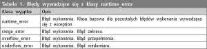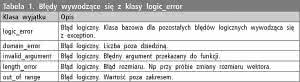 Najistotniejsza jest tutaj metoda wirtualna what(), która zwraca łańcuch tekstowy zawierający opis błędu. Wszystkie klasy wyjątków rzucane przez bibliotekę standardową jako klasę bazową wykorzystują exception, a zatem klauzula catch(exception &e) powoduje przechwycenie wszystkich wyjątków, klas pochodnych które dziedziczą z tej klasy. Pozostałe wyjątki które mogą być zgłaszane przez bibliotekę standardową C++, podzielono na błędy logiczne wywodzące się z klasy bazowej logic_error (tabela 1) oraz błędy wykonania wywodzące się z klasy runtime_error (tabela 2).