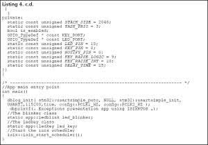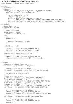 Klasa led_blink odpowiedzialna jest za cykliczne mruganie diodą D1, które jest realizowane w pętli głównej wątku led_blink:: main(). Mruganie diodą informuje nas o prawidłowym działaniu systemu operacyjnego i nie wymaga dalszego komentarza. Główna demonstracja mechanizmu wyjątków jest realizowana w klasie ledkey. W konstruktorze klasy led_blink porty PE.0 oraz PE.15 odpowiedzialne, odpowiednio: za pin testowy dla badania czasu wykonania wyjątku oraz sterowanie diodą LED, ustawiane są w kierunku wyjścia.
