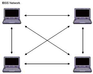 Mniej znana jest sieć typu Ad Hoc, której topologię pokazano na rysunku 2. Jest to sieć typu peer-to-peer, w której każdy z komputerów może bezpośrednio komunikować się ze wszystkimi komputerami tworzącymi sieć. Ta topologia może być stosowana do tworzenia rozległych sieci, bo jej węzły mogą pracować jako przekaźniki danych pomiędzy bardzo oddalonymi urządzeniami.