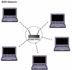 Wszystkie dane pomiędzy urządzeniami w sieci przepływają przez punkt dostępowy i nie ma możliwości transmisji bezpośrednio pomiędzy urządzeniami. Topologia Infrastructure najczęściej jest stosowana w sieciach domowych umożliwiających dostęp do szerokopasmowego Internetu (router z opcją Wi-Fi), w sieciach publicznych Hot Spot oraz w komercyjnych sieciach radiowych.