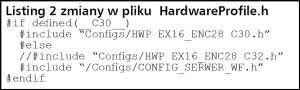 Zmodyfikowany plik zapamiętałem pod nazwą CONFIG_SERWER_WF.h. Aby konfiguracja była dołączona do projektu, trzeba zmienić kolejny plik HardwareProfile.h. Jego zawartość zamieszczono na listingu 2.