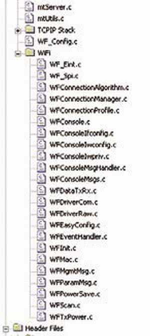 Kolejny krok modyfikacji projektu wygenerowanego przez TCPmaker to dodanie plików źródłowych obsługi interfejsu WiFi. W tym celu do sekcji plików źródłowych dodajemy podkatalog WiFi. Następnie do tego katalogu trzeba przekopiować wszystkie pliki z katalogu MicrochipTCPIP StackWiFi (rysunek 6). Oprócz tych plików dodajemy do projektu WF_Config.c z katalogu głównego. I na koniec trzeba usunąć komentarz z definicji w pliku MainDemo.c: