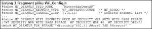 Można również obliczyć klucze za pomocą strony internetowej http://www.wireshark.org/tools/wpa-psk.html i wtedy uruchomienie programu zajmuje mniej czasu. Jednak potem konfigurowanie sieci z punktu widzenia użytkownika komplikuje się, bo trzeba te wyliczone klucze wpisać do pamięci konfiguracyjnej serwera. Dlatego w naszym projekcie pozostaniemy przy ich wyliczaniu przez moduł Wi-Fi. Najważniejsze fragmenty pliku WF_Config.h pokazano na listingu 3.