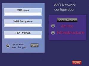 Rodzaj sieci (Ad Hoc lub Infrastructure) jest zmieniany sekwencyjnie przy klikaniu na przycisk Select Network. Wybrana sieć jest sygnalizowana zmianą koloru wskaźnika przy opisie typu sieci.