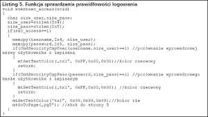 Fragment funkcji sprawdzania prawidłowości logowania pokazano na listingu 5. Na listingu 6 pokazano funkcję przywracająca "nastawy fabryczne", natomiast na listingu 7 fragment programu odpowiedzialny za porównanie nazwy użytkownika oraz hasła.