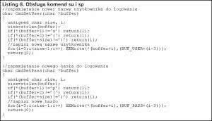 Funkcje obsługi tych komend zapamiętają wprowadzone dane w pamięci eeprom i mogą potem zostać użyte do ponownego logowania. Podobnie jak w przypadku ustawień sieci WiFi domyślne dane do logowania są ustawiane po zwarciu linii RB14 do masy w trakcie uruchamiania serwera. Funkcje obsługi komend su i sp pokazano na listingu 8.