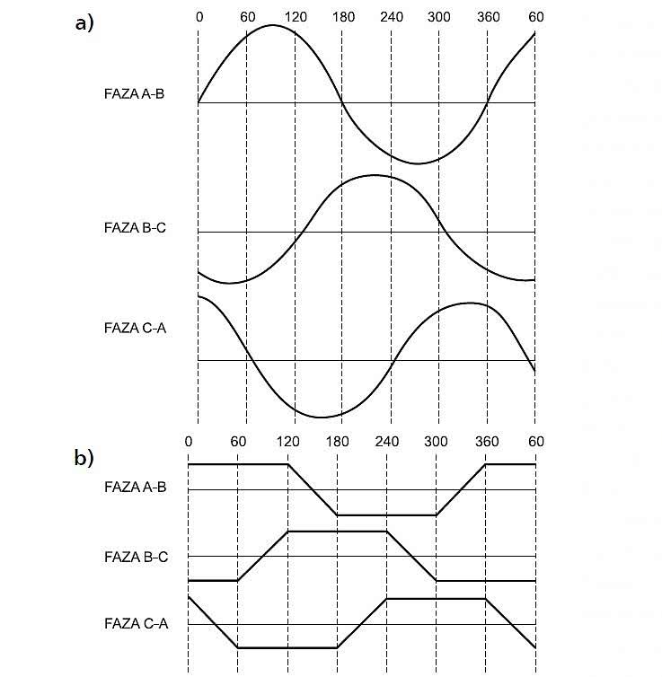 Rysunek 3. Przebieg (a) trapezoidalnych i (b) sinusoidalnych wstecznych sił elektromotorycznych w trójfazowym BLDC.