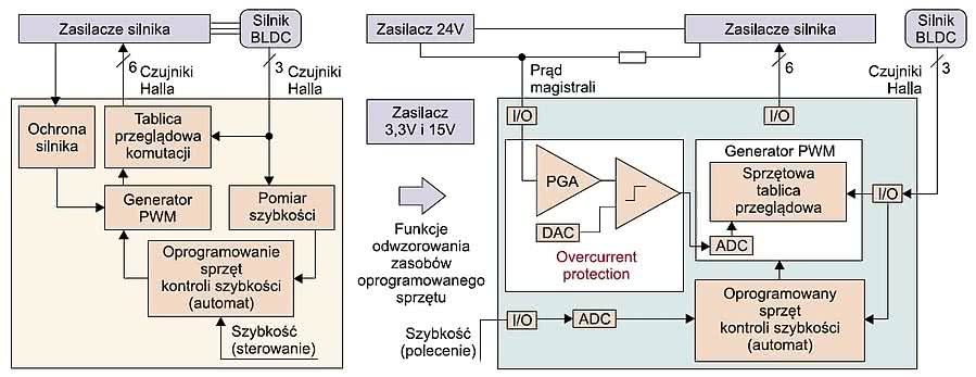 Rysunek 4. Schemat blokowy konfigurowalnego układu sterowania silnikiem BLDC z użyciem PWM, profili silnika, bloku zabezpieczeń nadprądowych i synchronizacji w oparciu o czujniki hallotronowe.