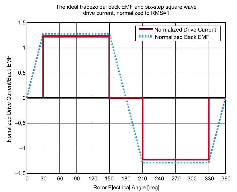Rysunek 6. Przebieg znormalizowanych: prądu zasilania i trapezoidalnej wstecznej siły elektromotorycznej w silniku z 6-stopniową komutacją
