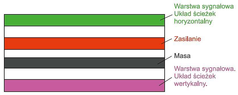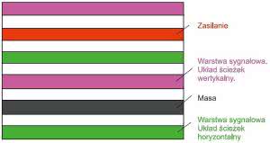 Dodatkowo, w celu zmniejszenia oddziaływania elektromagnetycznego między warstwami sygnałowymi warto, aby ścieżki na sąsiednich warstwach przebiegały względem siebie pod kątem prostym. Możliwym rozwiązaniem jest również utworzenie płaszczyzn masy na dwóch zewnętrznych warstwach, oraz rozprowadzenie ścieżek sygnałowych i zasilania na wewnętrznych.