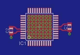 Rysunek 5. Sposób podłączenia kondensatorów odsprzęgających oraz dodatkowa powierzchnia masy umieszczona bezpośrednio pod układem scalonym