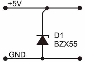 Szyna zasilająca musi być bezwzględnie chroniona przed przepięciami. Źródłem skoku napięcia może być pobliskie wyładowanie elektrostatyczne, bądź interferencja elektromagnetyczna. Remedium na to zjawisko jest wpięcie w kierunku zaporowym diody Zenera pomiędzy linie zasilającą, a masę (rysunek 7).