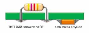 - THT na warstwie górnej, SMD na dolnej (rysunek 3). Elementy SMD należy najpierw przykleić do płytki przed lutowaniem na fali. Ponadto, nie ma możliwości lutowania BGA, a układy scalone o drobnym rastrze wyprowadzeń muszą mieć specjalne "łezki" do zbierania nadmiaru cyny. Zaletą natomiast jest to, że wystarczy płytka jednostronna.