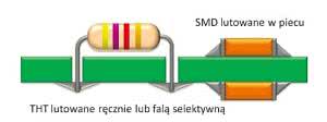 - SMD i THT na warstwie górnej (rysunek 2). Jest to najczęściej spotykany sposób rozmieszczania elementów, pozwalający na szybką i łatwą produkcję. Wszystkie elementy SMD są w pierwszej kolejności lutowane w piecu rozpływowym, a następnie elementy przewlekane są lutowane na fali.