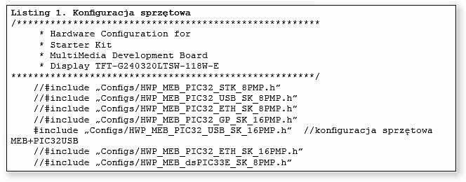 Po usunięciu komentarza z linii #include "Configs/HWP_MEB_PIC32_ USB_SK_16PMP.h jest dołączany plik konfiguracyjny Configs/HWP_MEB_PIC32_ USB_SK_16PMP.h zawierający wszystkie niezbędne definicje 16-bitowego interfejsu komunikacyjnego, stałych używanych przez procedury obsługi kontrolera wyświetlacza, linii interfejsu dotykowego itp.