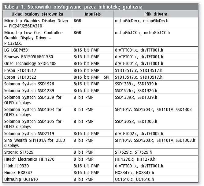 Firma Microchip również dostarcza dwa własne, programowe sterowniki matrycy LCD. Jeden wykorzystujący mikrokontroler PIC24FJ256DA210, a drugi mikrokontrolery z rodziny PIC32MX. Piny mikrokontrolerów sterują bezpośrednio wyprowadzeniami RGB wyświetlacza, a funkcje biblioteki graficznej są uruchamiane bezpośrednio na mikrokontrolerze sterownika. W tabeli 1 umieszczono wykaz obsługiwanych sterowników.