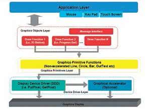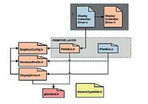 Biblioteka graficzna ma również budowę warstwową i składa się z 3 warstw, od najniższej do najwyższej: device driver layer, primitive layer i object layer (rysunek 2). Najniżej umieszczony element to fizyczny wyświetlacz LCD ze sterownikiem matrycy. Warstwa Device Driver Layer jest ściśle powiązana z zastosowanym wyświetlaczem, a właściwie z zastosowanym sterownikiem matrycy LCD. Procedury rysowania podstawowych elementów graficznych są zaimplementowane w warstwie Graphics Primitive Layer.