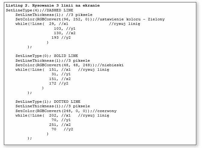 Funkcja w trybie Non Blocking zwraca "0", gdy rysowanie nie jest zakończone lub "1", gdy rysowanie zakończy się. W trybie Blocking funkcja zawsze zwraca "1". Linie mogą być rysowane liniami o dwóch grubościach: 1 piksel (NORMAL_LINE) i 3 pikseli (THICK_ LINE). Wyboru grubości linii dokonuje się za pomocą makra SetlineThickness(lnThickness). Na listingu 2 zamieszczono fragment programu rysującego 3 linie w 3 różnych kolorach przy włączonym trybie Blocking.