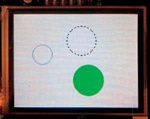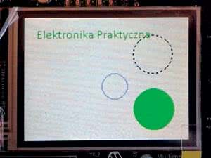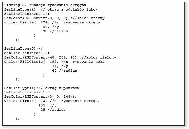 Wynik działania procedur z listingu 2 pokazano na fotografii 5. Funkcje rysowania okręgów Okręgi można rysować trzema różnymi stylami linii: ciągłą, kropkowaną i składającą się z odcinków łuków. Dodatkowo, można wypełnić wnętrze okręgu dowolnym kolorem, czyli inaczej mówiąc narysować koło o wybranym kolorze. Do rysowania okręgu zdefiniowano makro Circle(x, y, r), gdzie x, y to współrzędne środka okręgu, a r promień w pikselach. Do rysowania koła jest przeznaczone makro FillCircle(x, y, r). Przed wysyłaniem tych makr trzeba ustawić kolor rysowania okręgu lub koła funkcją SetColor i styl rysowania funkcją SetLineType (dokładnie tak samo, jak w przypadku rysowania linii). Na listingu 3 pokazano fragment programu rysującego 2 okręgi i koło, a na fotografii 6 wynik jego działania.