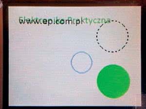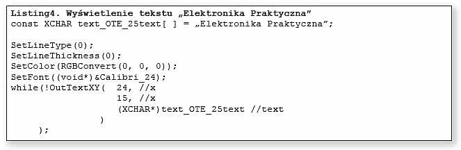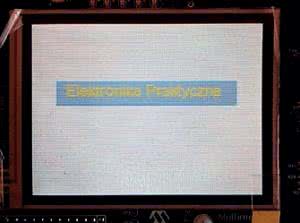 Przed wywołaniem OutText trzeba mieć zdefiniowana tablicę z wzorcami znaków i ustawić kolor znaków. Na listingu 4 pokazano przykład wyświetlania tekstu "Elektronika Praktyczna", a wynik działania zamieszczono na rysunku 7.