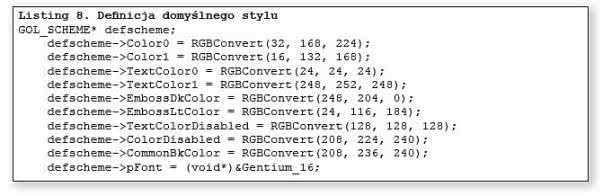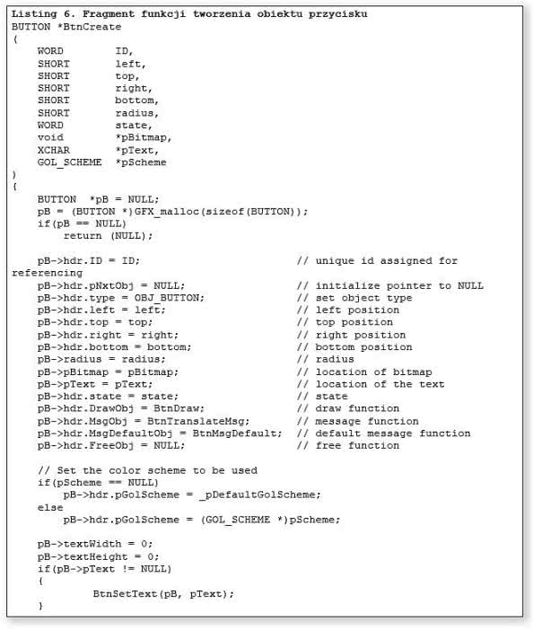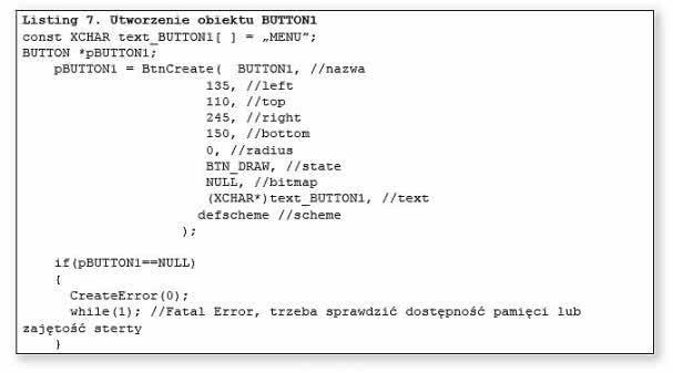 Całkowite ukrycie przycisku jest możliwe, gdy zdefiniujemy CommonBkColor taki sam, jak kolor tła. Argument *pFont jest wskaźnikiem na bufor zawierający tekst wyświetlany na przycisku. Kolor tego tekstu jest określany składowymi TextColor0 (przycisk wciśnięty) i TextColor1(przycisk zwolniony). Składowa DRAW_FUNC jest wskaźnikiem do funkcji rysowanego obiektu, FREE_ FUNC wskaźnikiem do funkcji zwalniania obiektu, a MSG_FUNC do funkcji wysyłania komunikatów. Przykładowy obiekt Button jest tworzony przez funkcję *BtnCreate. Fragment tej funkcji pokazano na listingu 6.