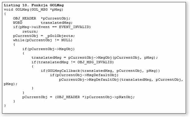 - Wewnątrz funkcji GOLMsg ze wskaźnikiem do struktury GOL_MSG jako argumentem (listing 10) jest wykonywana pętla wykrywająca obiekt generujący wiadomość.