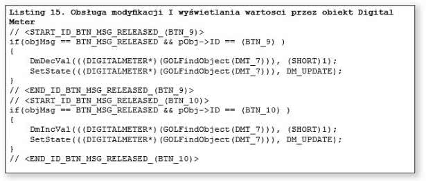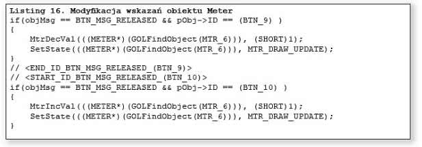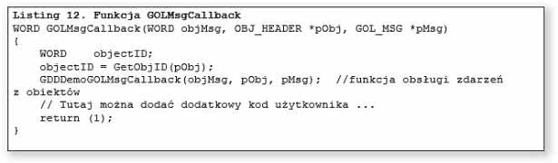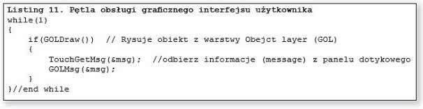 Na listingu 11 pokazano pętlę, w której jest wywoływana funkcja GOLGraw sprawdzająca stany obiektów i ewentualnie ry sująca je. Funkcja sprawdza czy z drivera ekranu dotykowego nie została przesłana informacja (message) o niewykonanej akcji (funkcja TouchGetMsg) i na końcu, na podstawie tej informacji, funkcja GOLMsg interpretuje tę wiadomość i przekazuje sterowanie do funkcji GOLMsgCallback (listing 12). Przed wywołaniem tej pętli wszystkie używane obiekty graficzne muszą być utworzone.