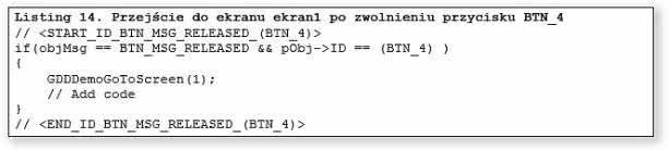 Pierwsze działanie polega na dodaniu akcji wykonywanej po zaistnieniu zdarzenia. Dostępne akcje są automatycznie określane przez GDD-X na podstawie właściwości elementów umieszczonych w oknie z rys. 19. Na rysunku 20 pokazano możliwość wyboru akcji przy kliknięciu na zdarzenie RELEASE. Można wybrać jakiś element z ekranu ekran lub sam ekran, albo wykonać skok do ekranu ekran1. Ponieważ na ekranach nie ma elementów, którymi można byłoby manipulować po naciśnięciu i zwolnieniu przycisku, to wybierzemy akcję Go To Screen1 → ekran1. Po takim zdefiniowaniu akcji BTN_4 RELEASED program powinien przejść do ekranu ekran1, kiedy naciśniemy i zwolnimy przycisk nazwany "ekran1". Nie dość, że GDD-X sam skonfiguruje wykonanie akcji po zdarzeniu, to jeszcze automatycznie uaktualni plik źródłowy w projekcie MPLAB-X. Obsługa zdarzeń jest wykonywana w funkcji GDDDemoGOLMsgCallback umieszczonej w pliku GDD_X_Event_Handler.c. Ta funkcja jest z kolei wywoływana z funkcji GOLMsgCallback. Obie są automatycznie generowane przez GDD-X. Na list. 13 pokazano fragment akcji przejścia do ekranu ekran1 po zwolnieniu przycisku BTN_4.